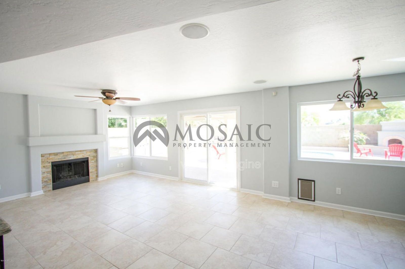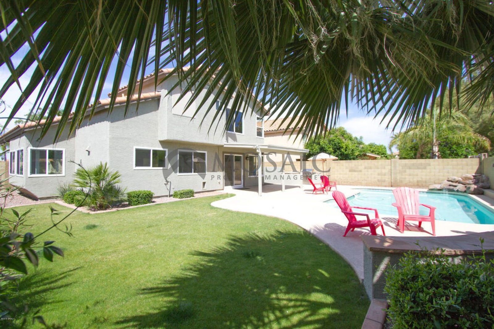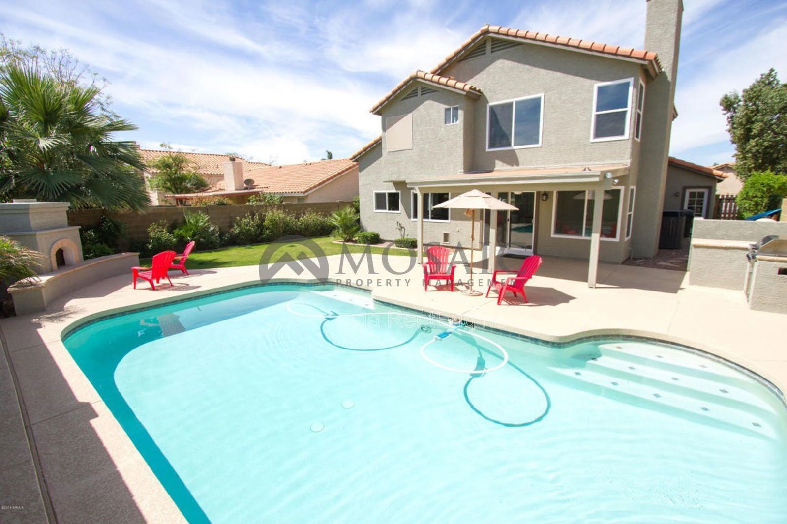 Gorgeous, updated two story home with tile and carpet in all the right places. This house has a large, open floor plan with vaulted ceilings. Kitchen includes STAINLESS STEEL APPLIANCES, granite countertops, and island. Beautiful fireplace in the living room. The master bathroom boasts a gorgeous, remodeled walk-in tile shower. Huge backyard oasis with fenced pool, fireplace, grass, and built in BBQ. This home backs to a community greenbelt. Close to EVERYTHING; shopping, schools, freeways and more.