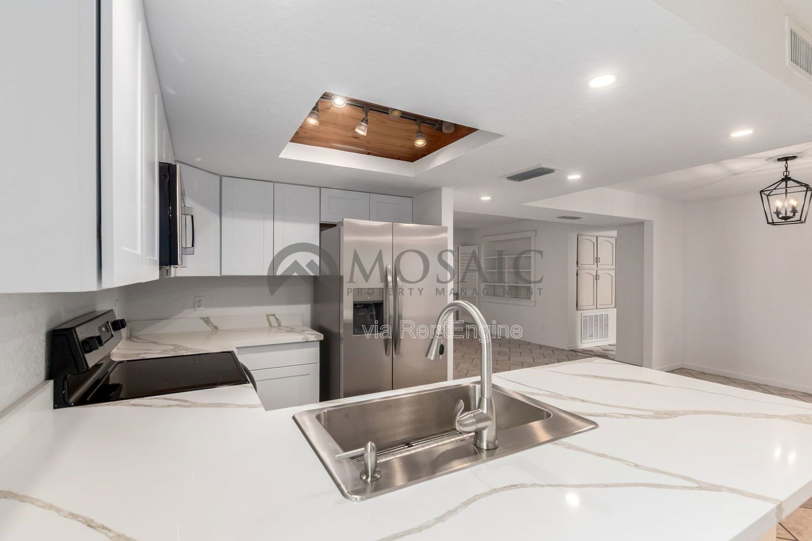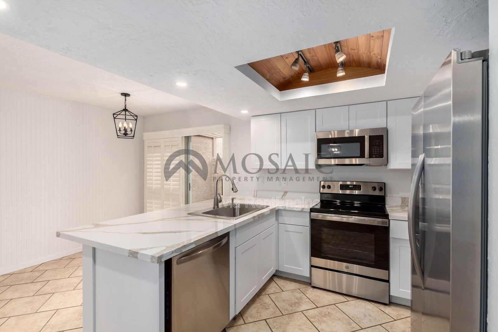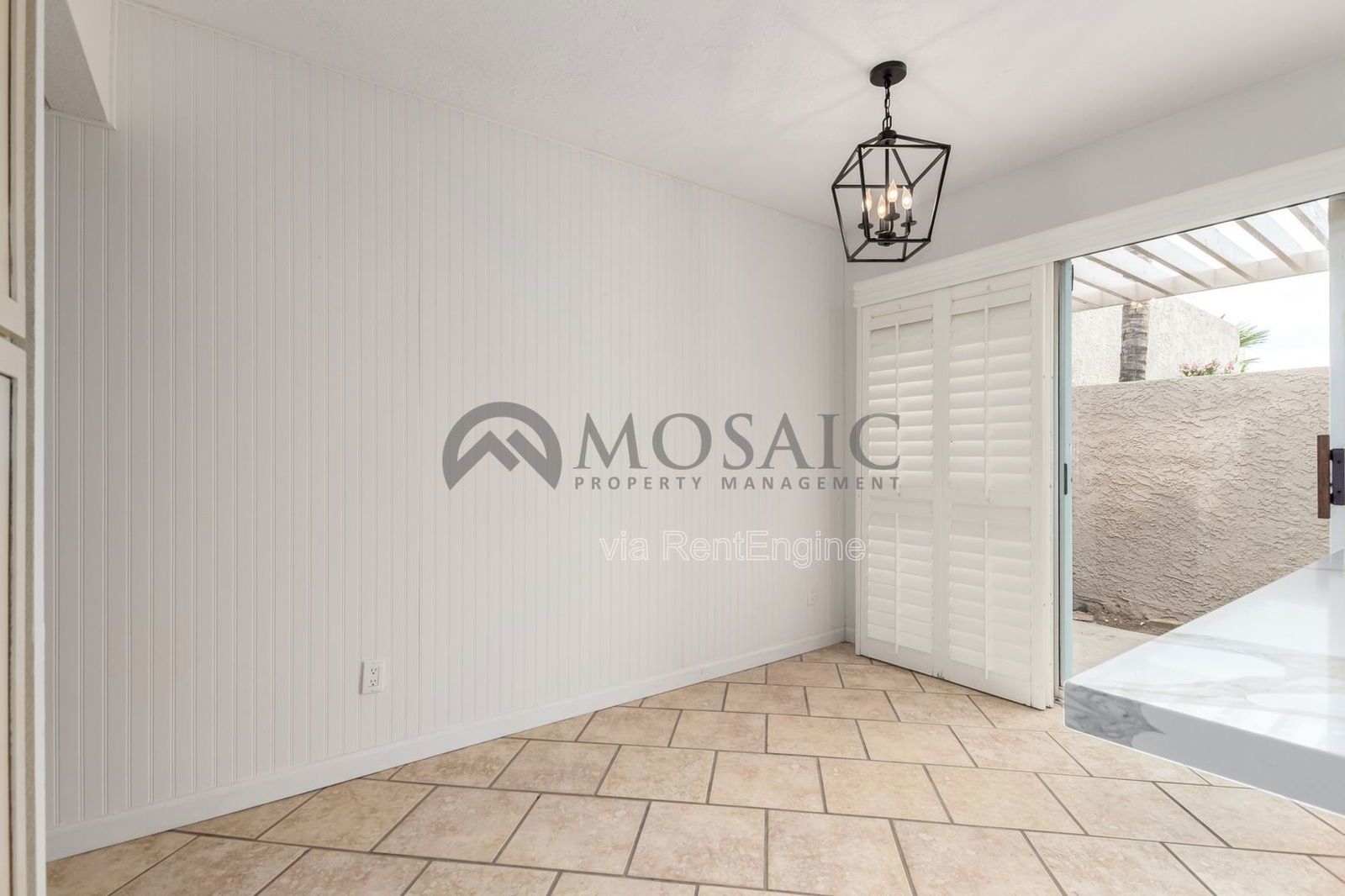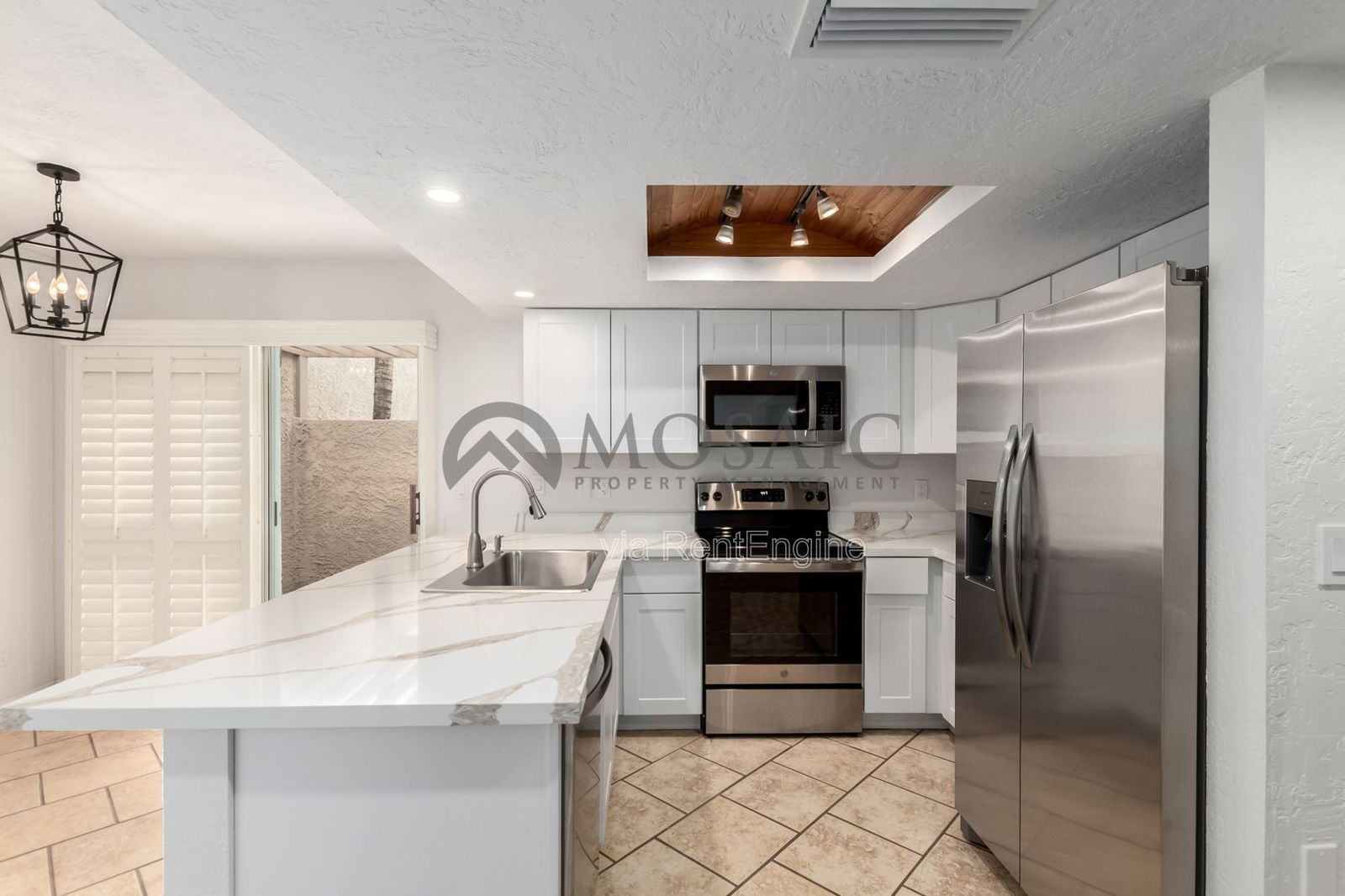 The home features upgrades and timeless finishes. The living area features a fireplace, updated lighting, wood shutters and sits off an expansive covered patio. Stepping into the kitchen you immediatly notice the brand new quartz counters, cabinetry and stainless steel appliances. The dining area has custom wood paneling and slider that opens to another private patio area.