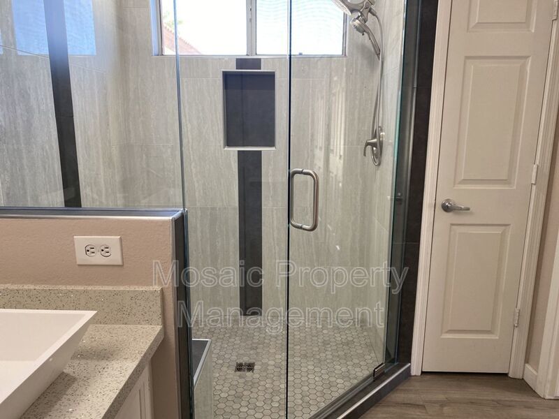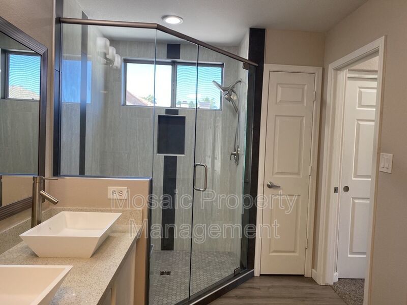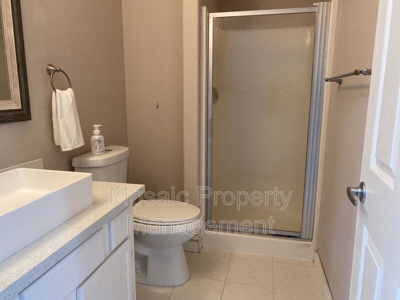 The bathrooms showcase modern sink basins, sleek plumbing fixtures, and a stunning tiled walk-in shower that adds a touch of luxury. Additional features include newer carpet, ceiling fans in both bedrooms, ample closet space, and a convenient downstairs laundry area.