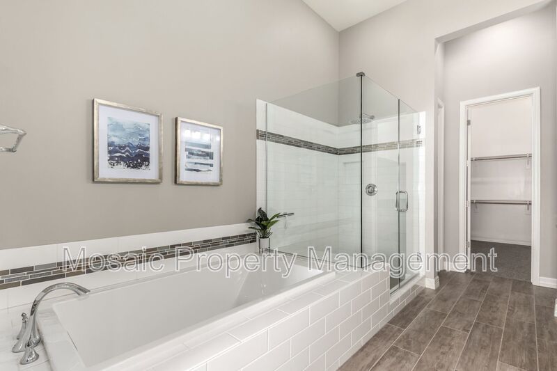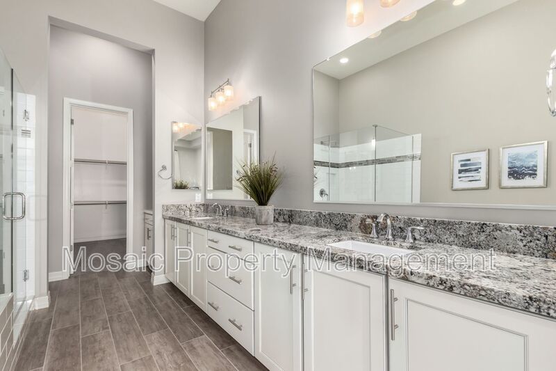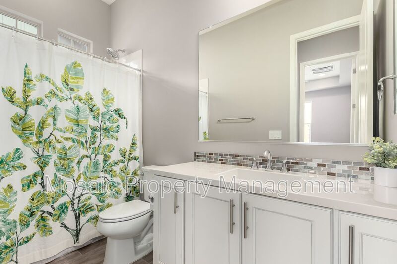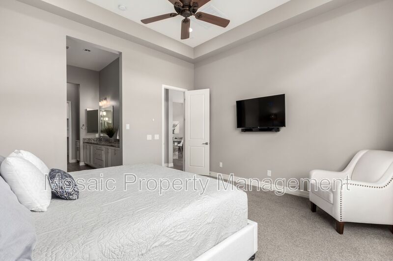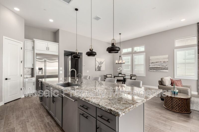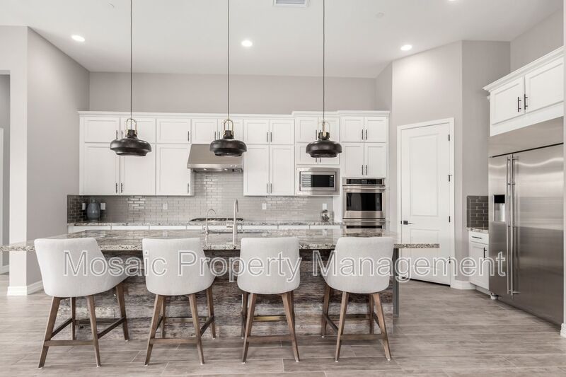 The master suite, located away from the secondary bedrooms, offers a serene escape, complete with custom blinds, a spacious walk-in closet, and a spa-inspired bathroom featuring a relaxing soaker tub. Throughout the home, high-end finishes elevate the living experience. The custom chef’s kitchen is a showstopper, showcasing elegant white double-stacked cabinetry, a striking 12' granite island, a beautifully tiled glass backsplash, and sleek pendant lighting. Premium Monogram appliances, including a 42" built-in refrigerator, wine fridge, dual ovens, custom hood vent, dishwasher, microwave, and reverse osmosis system, combine form and function for the ultimate culinary experience.