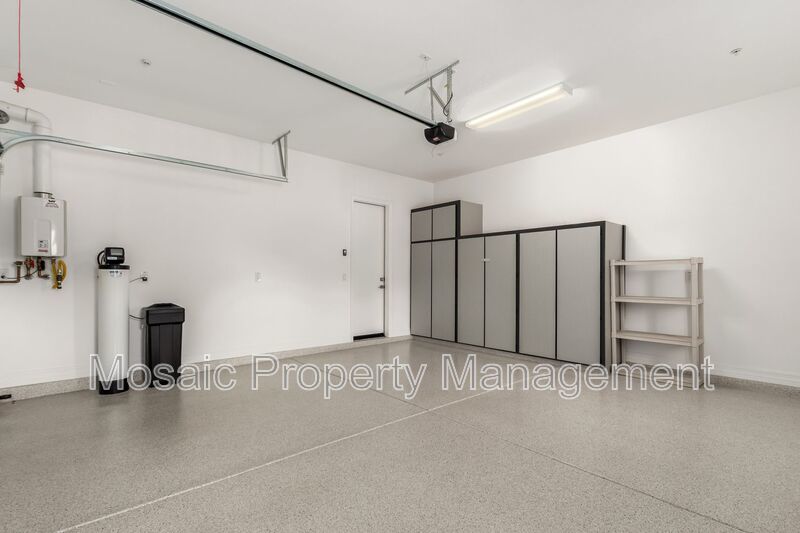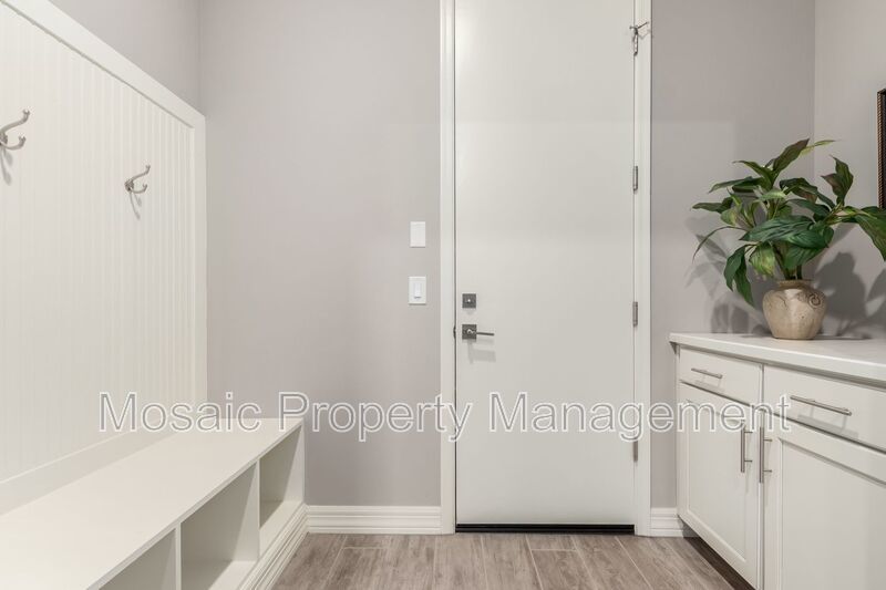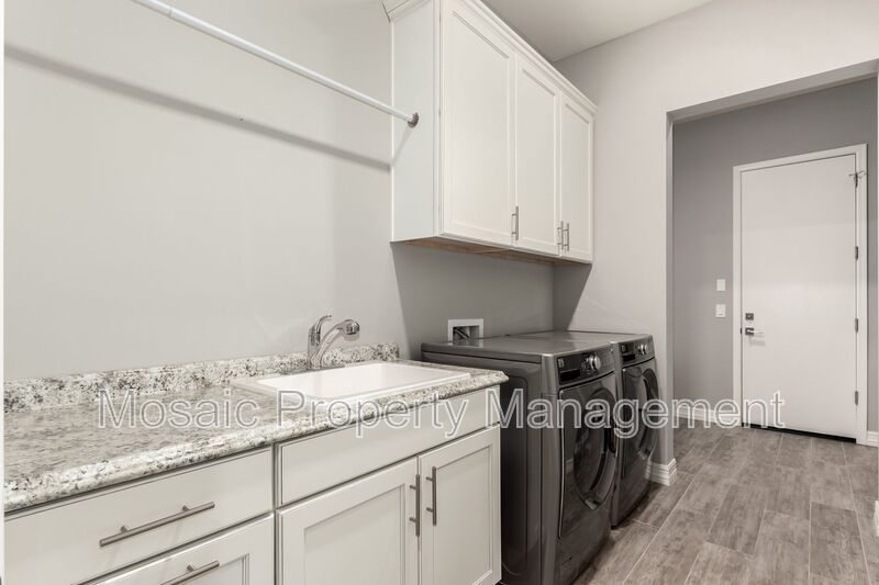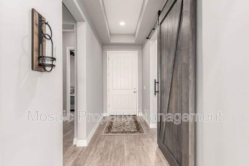 Rustic touches like a rolling barn door and barn wood accents bring warmth and character to the space, while additional features such as an epoxy-coated garage floor, built-in garage storage, water softener, and a large laundry room with custom cabinetry, mudroom bench, and sink add convenience and practicality.