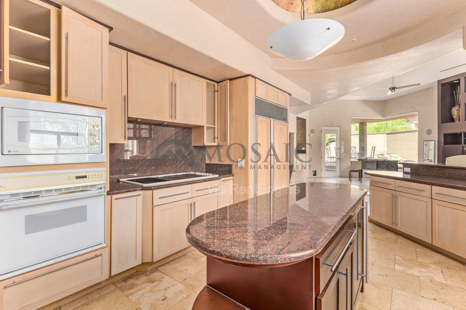This house has spacious, open-concept kitchen featuring granite countertops, a large walk-in pantry, double wall ovens, and a built-in wine fridge in the island—perfect for hosting or enjoying a quiet evening in. The home boasts multiple living areas, including a formal dining room, separate family and living rooms, and a stylish lounge area.