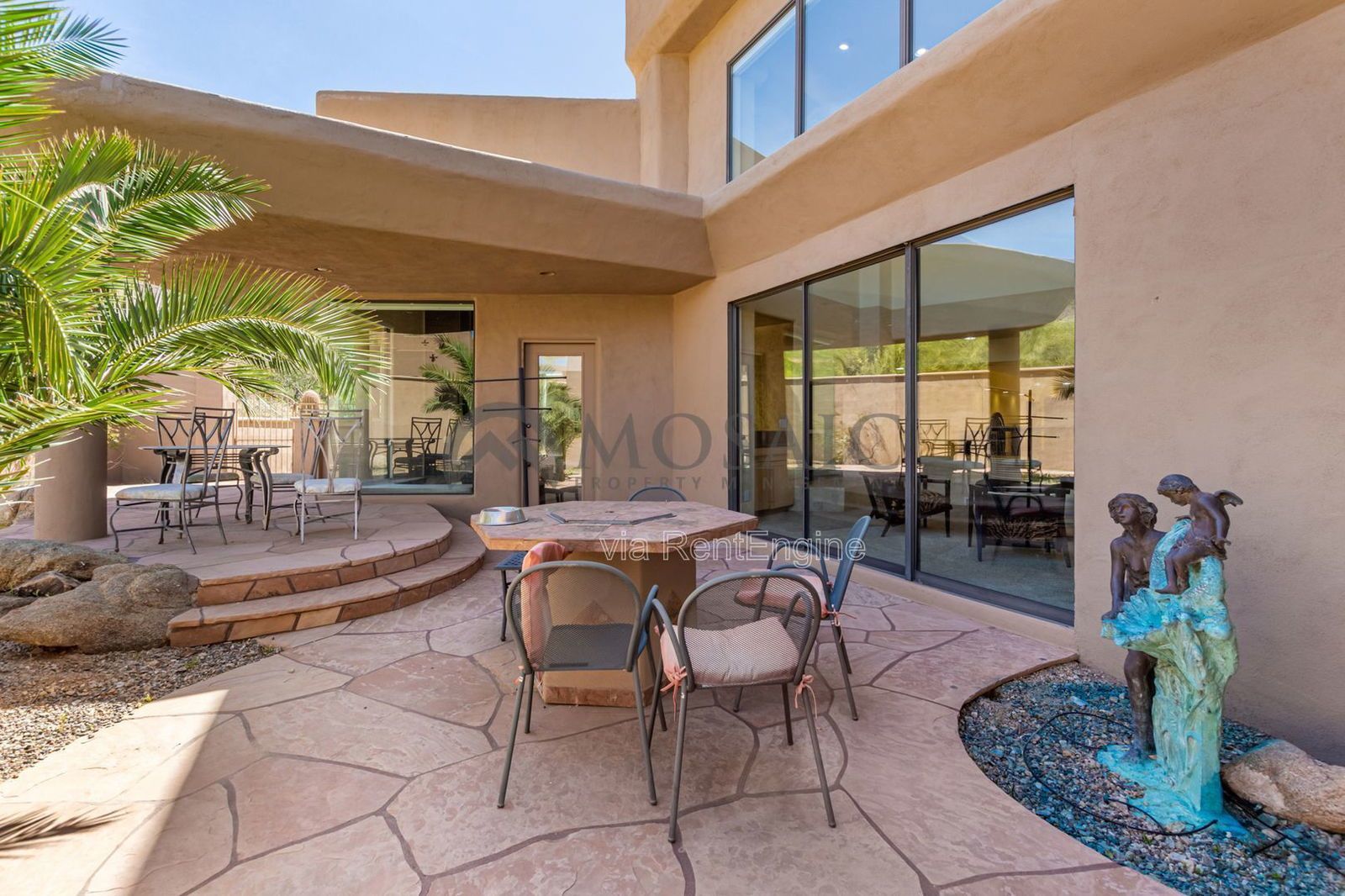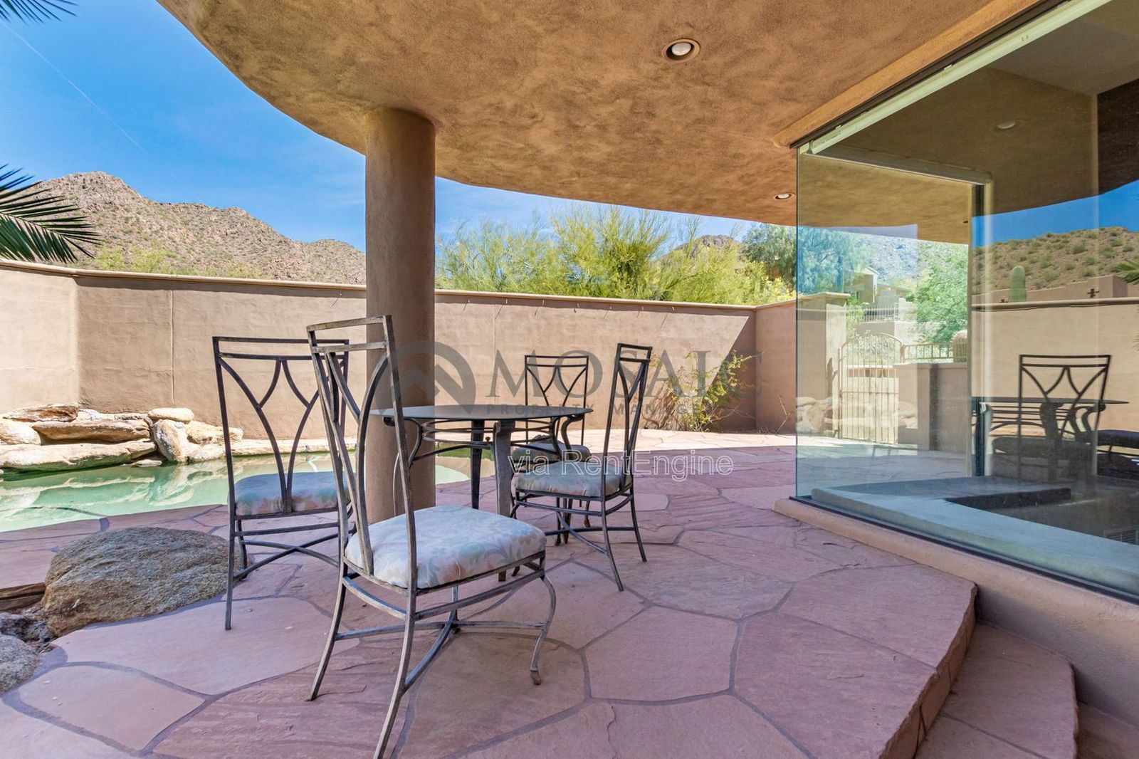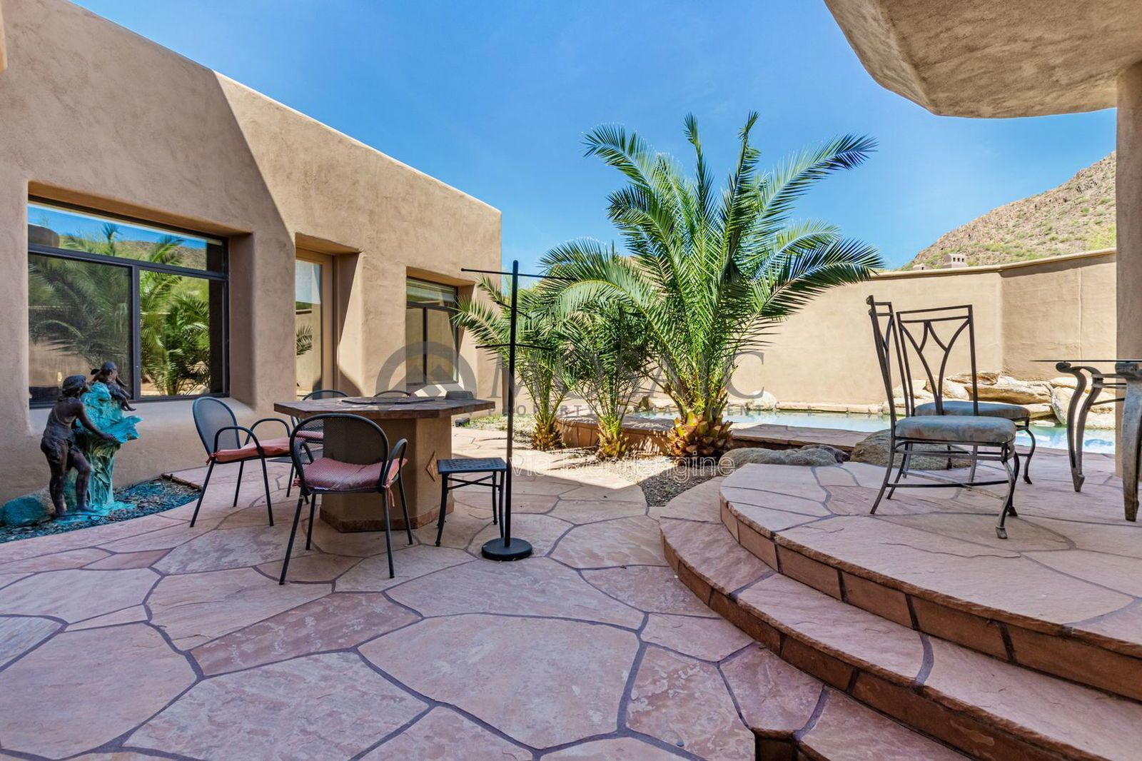 Step outside and unwind in the resort-style backyard, complete with lush landscaping, stone patio seating areas, and a sparkling pool—all set against the breathtaking mountain backdrop.